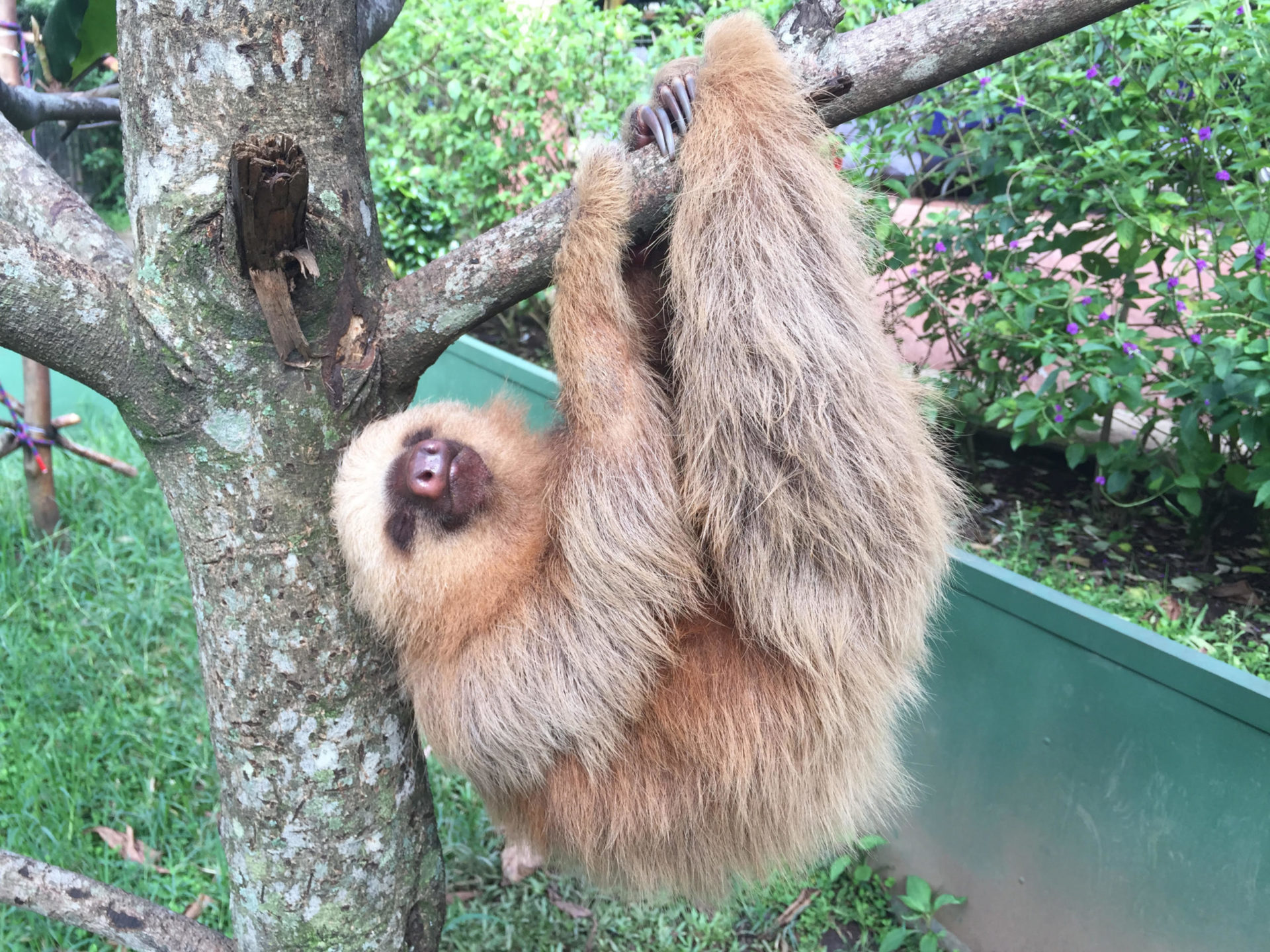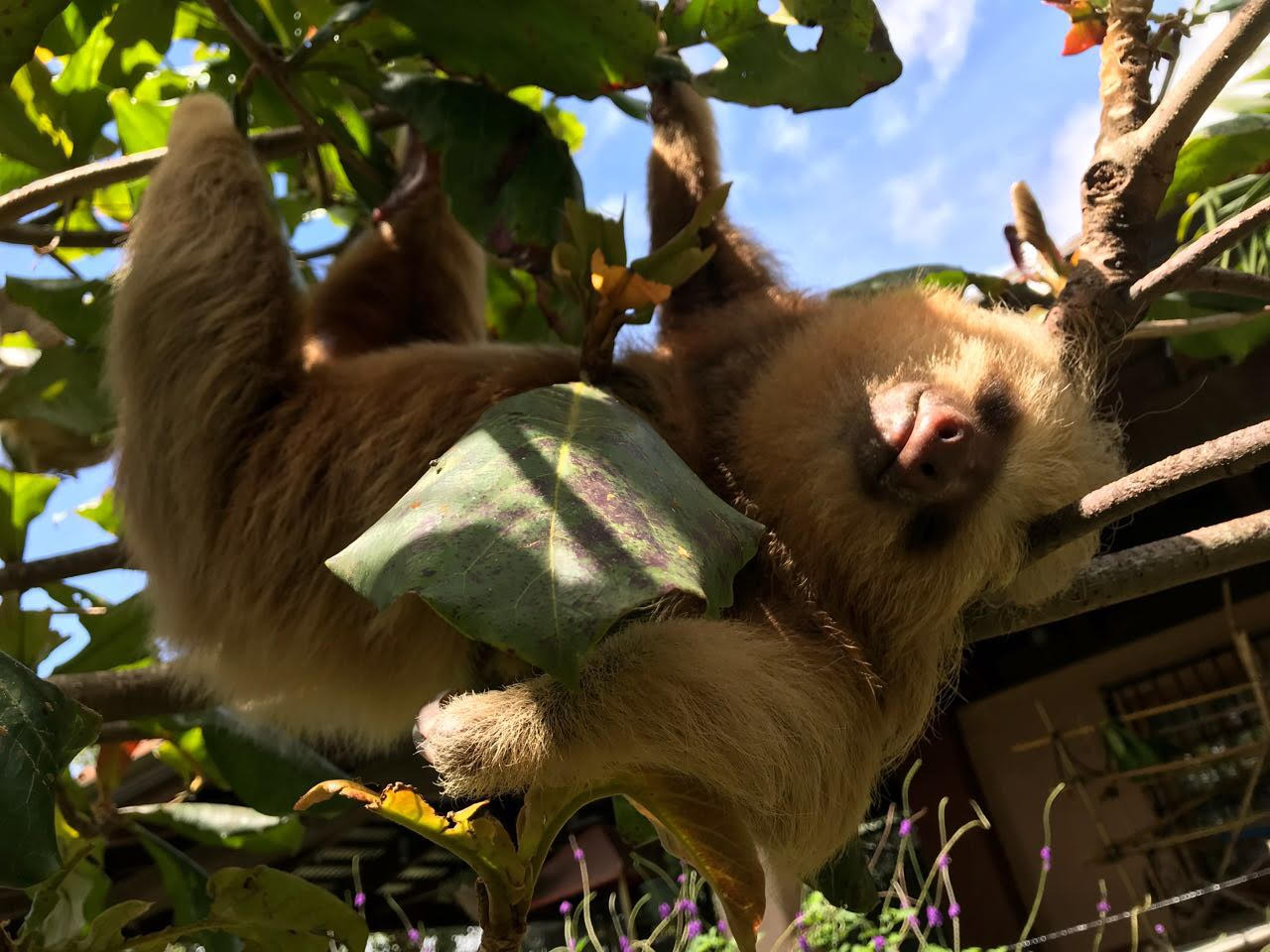 While at the clinic Santana loved his smoothies and would rip the syringe from his caregivers hands if he wasn’t being fed fast enough. Santana was also a leaf snob and would refuse any leaves that were not perfect/young/fresh enough. He was also a master escape artist. Santana was originally confined to help with his recovery but as he gained strength he found dozens of ways to get out. He somehow fit through the tiniest openings, something we had never seen a sloth do before. After about a week or so, Santana was moved into the sloth house, which is a more open space, and still managed to escape every now and then. Throughout all of this Santana occasionally showed his softer side. He was introduced to the other highschooler sloths (a group of seven orphaned two-fingered sloths that were around his age and size) and would sometimes sniff the others and occasionally kiss Toffee (another two-fingered sloth). This would last for a few minutes before he started swatting at Toffee’s head making it clear that he was a solitary animal and did not want to be bothered with the group.