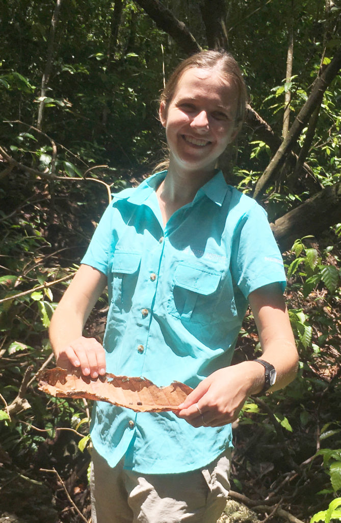 Once she was happily up in the canopy, naturally, we fossicked around the base of tree to look for her little pellet poop. We found it! Bagged it. And I sent it off to the lab for analysis. (Here I am showing one poop pellet on a leaf.)