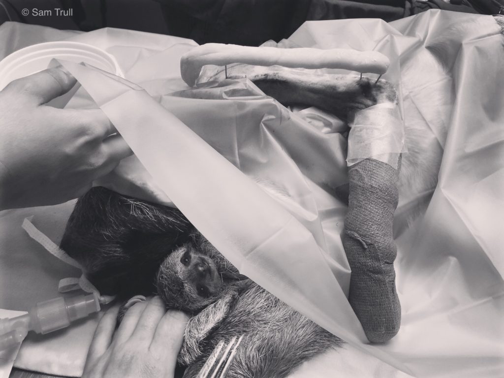 Milena the Sloth and her baby during surgery for her broken arm